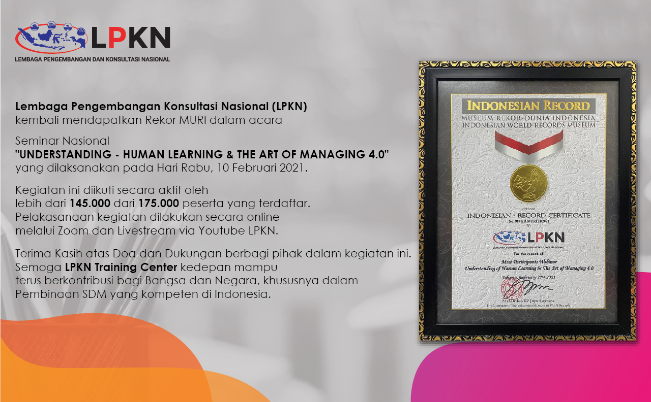 Jakarta, 22 Februari 2021, LPKN Training Center sebagai Lembaga Pelatihan yang telah berkiprah dalam sektor pengembangan SDM, kembali mendapatkan Rekor MURI , atas penyelenggaraan kegiatan Pelatihan secara Daring, yang diikuti oleh lebih dari 100.000 peserta melalui ZOOM dan Youtube.